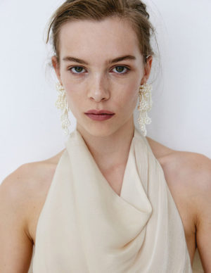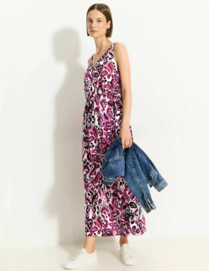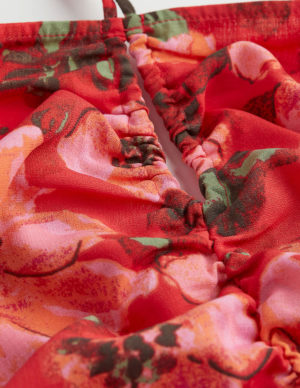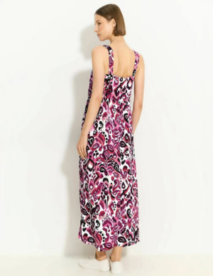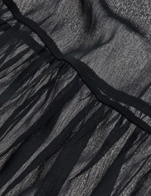 L XLДовгий сарафан з прозорого шифону з V-подібним вирізом горловини та вузькими зав’язками, що протягуються крізь невеликі петлі та зав’язуються ззаду. Шов під грудьми, відкрита частина ззаду та вузька гумка на талії ззаду. Спідниця-кльош зі зібраним швом над подолом. Без підкладки