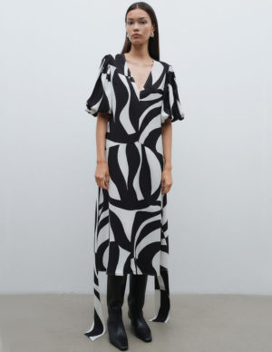 XS S M L XLДовга сукня з тканої тканини з V-подібним вирізом горловини, прихованою блискавкою з одного боку та широким знімним поясом на талії. Короткі рукави-балончики на підкладці та розкльошена спідниця