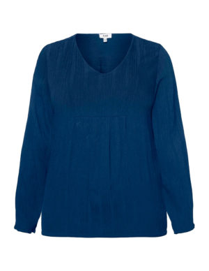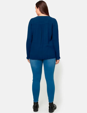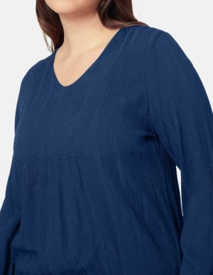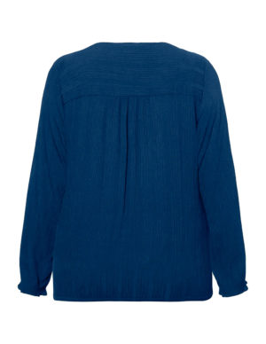 6XLБлуза з V-подібним вирізом горловини і квадратний виріз на грудях, оброблений ефектом рюшів, який спадає вниз. Із віскозної тканини та кокеткою ззаду