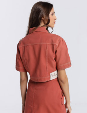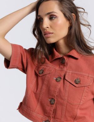 MДжинсовка з короткими рукавами із бавовняного деніму з коміром. Спереду дві нагрудні кишені з клапоном, застібається на ґудзики спереду