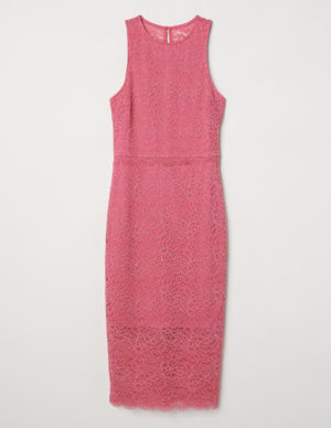Кружевное платье до колен, подчеркивающее фигуру. V-образный вырез спереди и сзади, короткие рукава-кимоно. Частично на подкладке