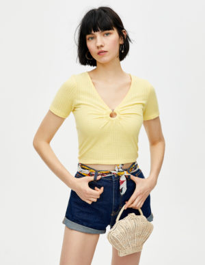 Футболка в смужку із бавовняного трикотажу, виріз горловини-човником