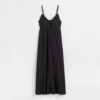 Сукня до литок з м’яко драпірованого трикотажу з квадратним вирізом спереду та вузькими бретельками, що зав’язуються ззаду на горловині. Подовжені рукави зі шнурком та вузькими зав’язками на манжетах для зібраного ефекту. Шов на талії та м’яко драпірована, злегка розкльошена спідниця