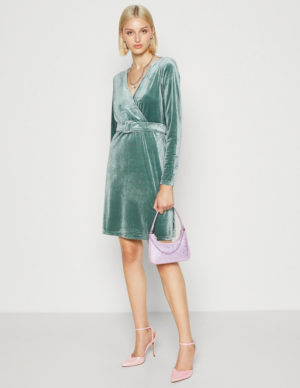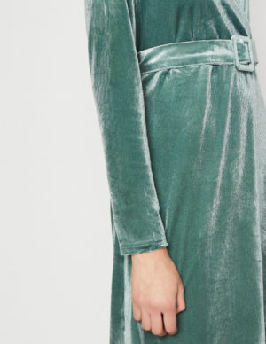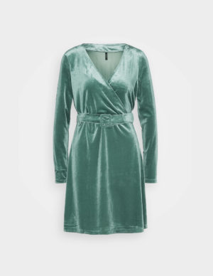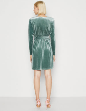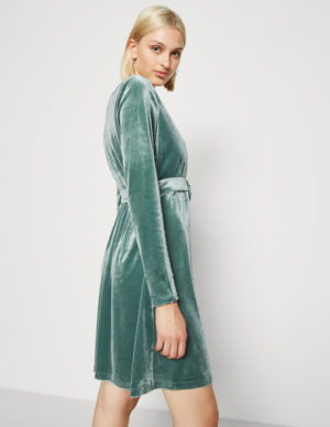 MВельветова сукня довжиною до коліна з глибоким V-подібним вирізом горловини. Довгі рукава та ремінь на поясі із тієї ж тканини