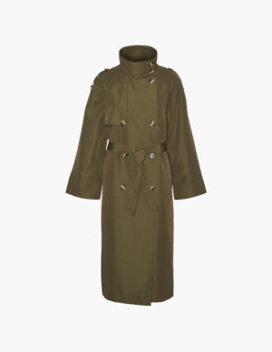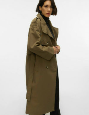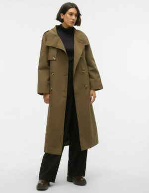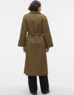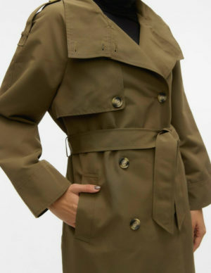MПлащ з високим коміром на ґудзиках та довгі рукава. Ремінь із тієї ж тканини на поясі, застібається на ґудзики спереду. Дві бічні кишені
