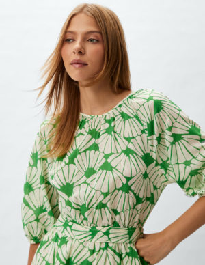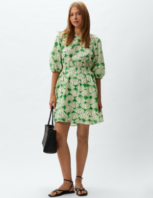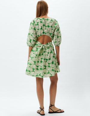 LКоротка сукня з бавовняного плетіння з круглим вирізом горловини та застібкою на ґудзику ззаду. Об’ємні рукави реглан довжиною 3/4 з вузькою закритою гумкою на манжетах. Відкритий ззаду та шов на талії із зав’язками ззаду. Розкльошена, м’яко драпірована спідниця на підкладці