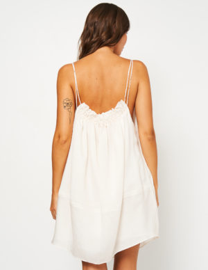 SКоротка сукня з віскози. Модель без рукавів з V-подібним вирізом та переднім отвіром зі шнурком, що зав’язується на потилиці та переходить у тонкі зав’язки. Тонкі регульовані бретельки та обрізна частина ззаду на ліфі. Бічні та задні отвір. Спідниця А-силуету з закритою гумкою зверху. Без підкладки