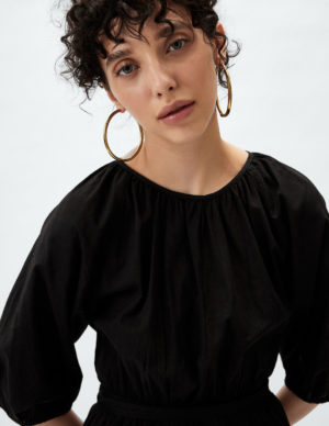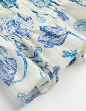 XXLБлузка з бавовняного плетіння. Квадратний виріз горловини з прихованою гумкою та застібкою-замком з вузькими зав’язками спереду. Короткі пишні рукави з оборками, широкий шов на талії та розкльошена баска для чіткого силуету. Без підкладки