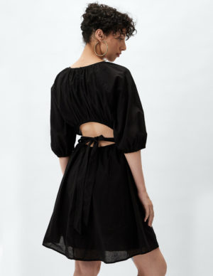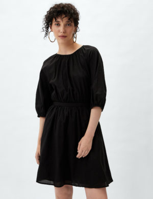 XL XXLКоротка сукня з бавовняного плетіння з круглим вирізом горловини та застібкою на ґудзику ззаду. Об’ємні рукави реглан довжиною 3/4 з вузькою закритою гумкою на манжетах. Відкритий ззаду та шов на талії із зав’язками ззаду. Розкльошена, м’яко драпірована спідниця на підкладці