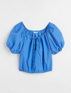 L XLБлузка з повітряного переплетення льону та бавовни. Круглий виріз горловини з V-подібним вирізом та вузькими зав’язками зверху, короткі пишні рукави з закритою гумкою та закритою гумкою по низу. Без підкладки
