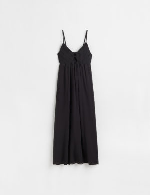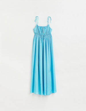 SДовга сукня без рукавів з крепового плетіння з бретелями тюлю-спагеті на зав’язках, квадратним вирізом горловини зі шнурком та розрізом спереду на зав’язках. З начосом та шнурком з вузькими зав’язками на талії, а також спідницею А-силуету з високим розрізом спереду. Без підкладки
