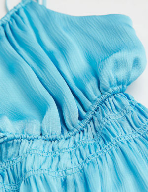 SСукня до литок з повітряного, м’яко драпірованого шифону з V-подібним вирізом та вузькими регульованими бретелями. Плісований ліф з вирізом та декоративним кільцем спереду та облямівкою ззаду. Атласова підкладка