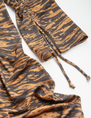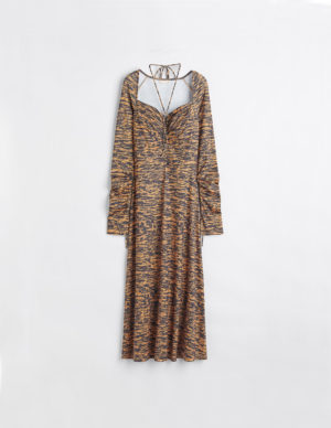 S LСукня до литок з м’яко драпірованого трикотажу з квадратним вирізом спереду та вузькими бретельками, що зав’язуються ззаду на горловині. Подовжені рукави зі шнурком та вузькими зав’язками на манжетах для зібраного ефекту. Шов на талії та м’яко драпірована, злегка розкльошена спідниця
