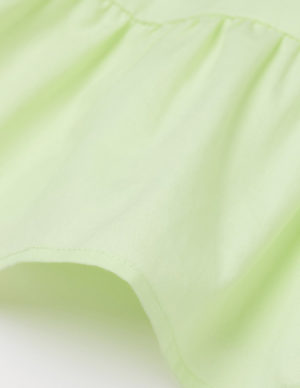 SКоротка сукня прямого крою з тканого переробленого поліестеру з круглим вирізом горловини, короткими пишними рукавами з тонкою гумкою на манжетах, відкритою спиною та тонкою бретелькою, що зав’язується за горловиною, та широким зібраним рюшем по низу