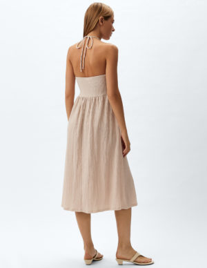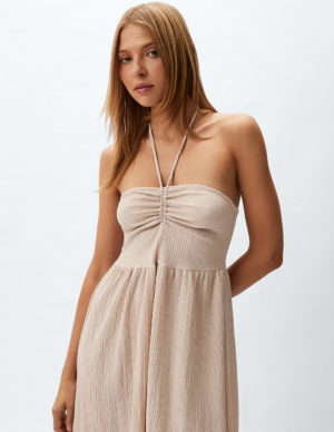 XS M XLСукня без рукавів, довжиною до литок, з м’ятого трикотажу. Виріз горловини-халтер зі шнурком посередині грудей та вузькими зав’язками, що застібаються ззаду на горловині. Зібраний шов на талії та м’яко драпірована, злегка розкльошена спідниця