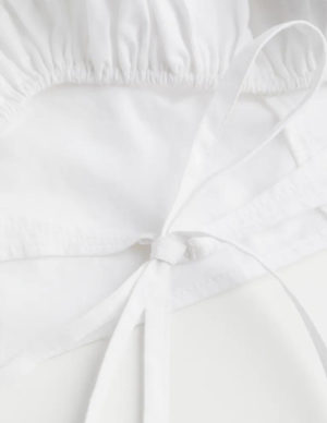 SКоротка сукня-сорочка із щільного бавовняного попліну. V-подібний виріз з лацканами, гудзики спереду та короткі рукави. Вирізи на талії, вузька потайна гумка зверху, частково відкрита спина і злегка розкльошена спідниця. Без підкладки
