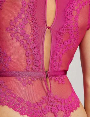 MВідчуйте себе сексуально у цьому неймовірно розкішному боді з короткими рукавами та відкритою спиною. Цей боді має гарну обробку на ґудзиках спереду та майже повністю виготовлений з мережива
