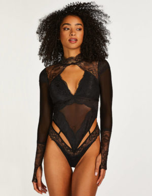 SЦей модний боді виготовлений з напівпрозорого мережива, яке поєднується з сіткою спереду. Задня частина боді частково відкрита