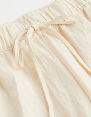 MШтани до литок з лляно-віскозного переплетення. Висока талія з прихованою гумкою, непомітні кишені в бічних швах і широкі, прямі штанини