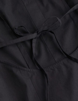 SКоротка сукня з лляно-бавовняної тканини з круглим вирізом, планкою з потайними гудзиками та кокеткою ззаду. Відрізний виріб з куліскою та вузькими зав’язками на талії. Довгі рукави-ліхтарики із вузькою закритою гумкою на манжетах. Без підкладки