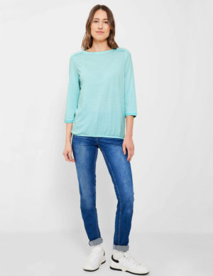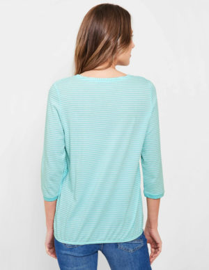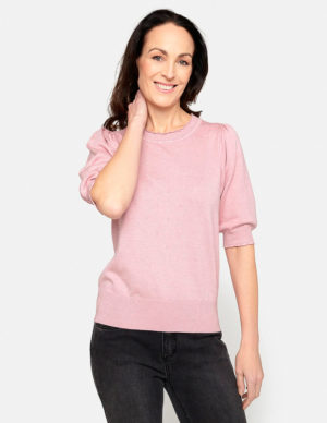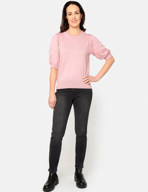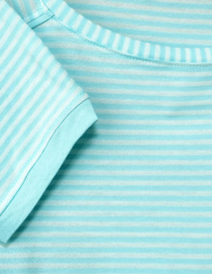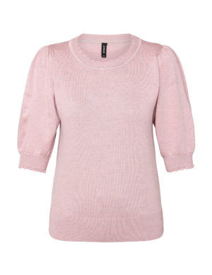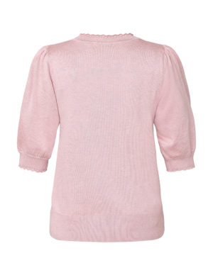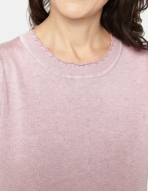LФутболка з круглим вирізом горловини із суміші віскози. Короткі рукава буфи та тонкі плетені крапки спереду. Окантовка в рубчик із тонким мереживом на горловині та рукавах