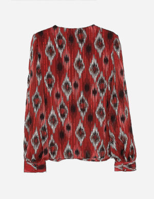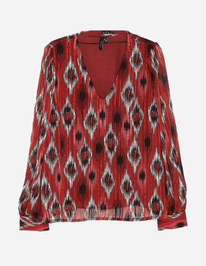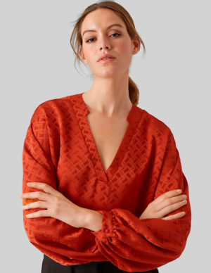 MБлискуча блуза з однотонним малюнком і V-подібним вирізом горловини. Рукава зібрані по краях для гарного ефекту, манжети на ґудзиках