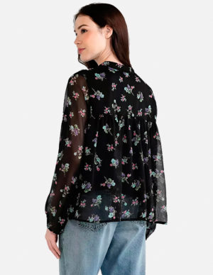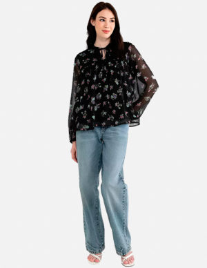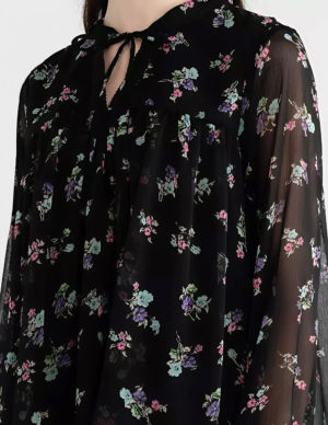 MБлуза з квітковим принтом та напівпрозорими рукавами. V-подібний виріз горловини на зав’язці