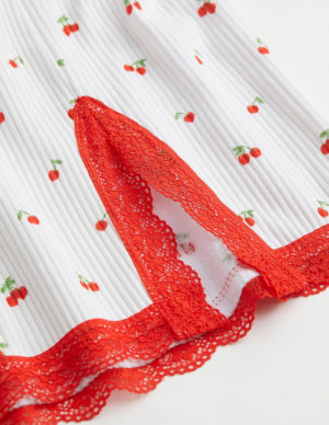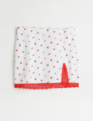 LКоротка спідниця з трикотажу в рубчик з принтом. Завищена, прикрита еластична талія. Низ оброблений мереживом, розріз збоку