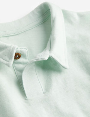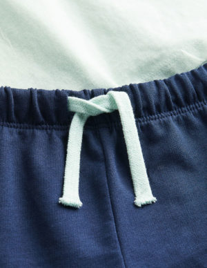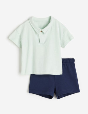 68 смМ’який бавовняний костюм з футболкою і шортами. Футболка з класичним коміром на ґудзику, спущена лінія плечового шва та короткі рукава. Шорти виготовлені із легкої світшотної тканини та мають еластичний пояс зі шнурком на талії