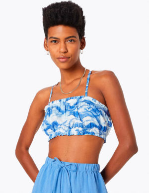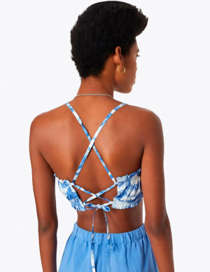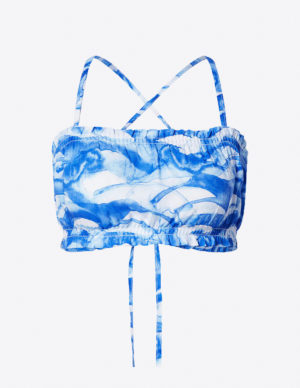 XSКороткий топ на тоненьких бетелях які перехрещуються на спині із віскозної тканини з принтом. Еластичний драпірований верх та низ, відкрита спина на зав’язці