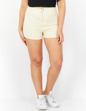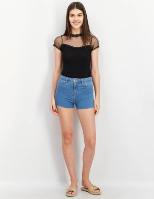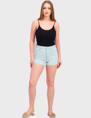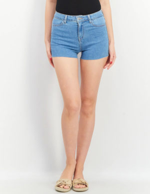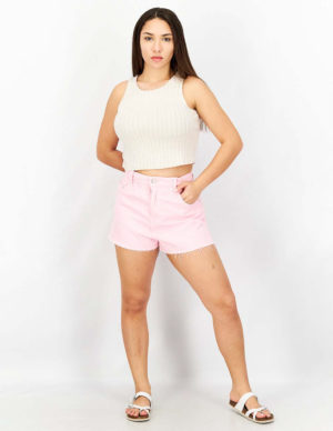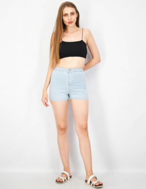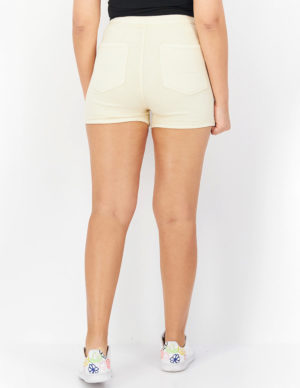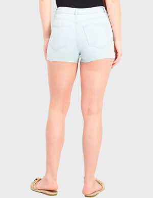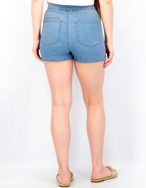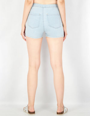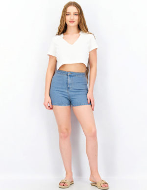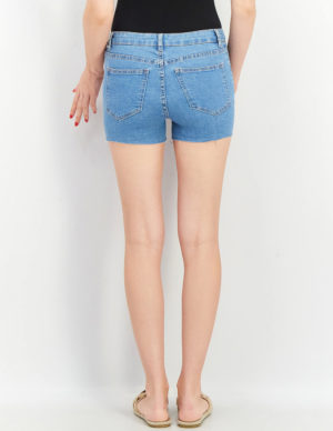 20Шорти з еластичним поясом з п’ятьма кишенями із бавовняного деніму. Застібається на блискавку та ґудзик, необроблені края