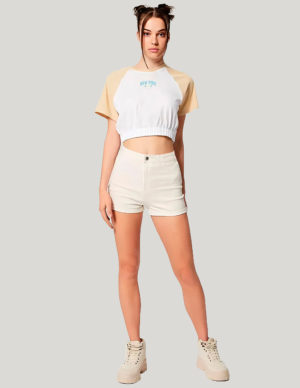 22Шорти з п’ятьма кишенями із бавовняного деніму. Застібається на блискавку та ґудзик, необроблені края