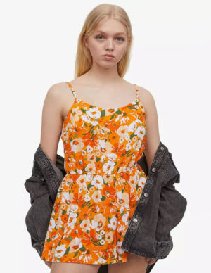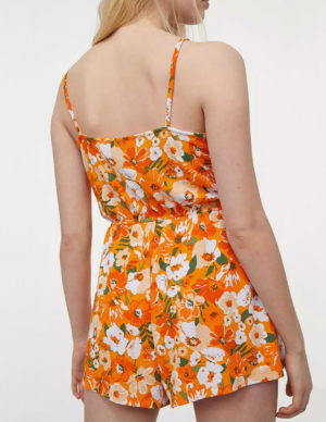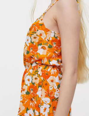 SКомбінезон із м’якої трикотажної тканини в квітковий принт. Круглий виріз горловини, вузькі бретелі. Еластичний пояс на талії