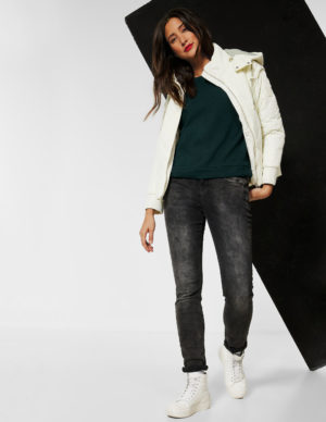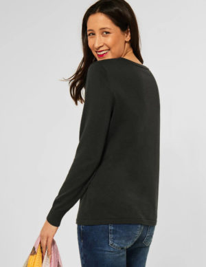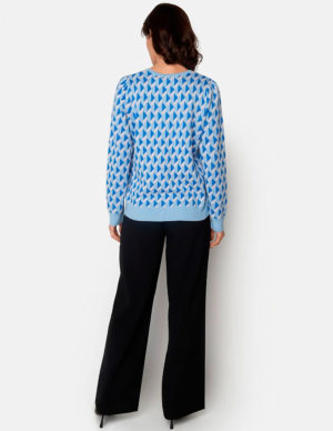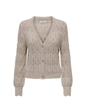 SВ’язана кофта з V-подібним вирізом горловини та довгі рукава з манжетами. Засібається на ґудзики спереду, окантовка в рубчик по краях