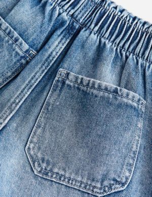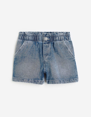 104 смВільні шорти з еластичним поясом із випраного бавовняного деніму. Діагональні передні кишені та накладні задні. Фальшива застібка