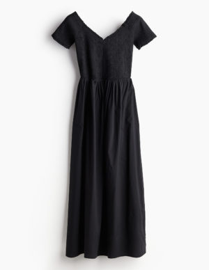XS S M XL XXLСукня до литок з тканої тканини з V-подібним вирізом горловини з відкритими плечима, облягаючим ліфом і короткими рукавами з облямівкою. Збірки на талії та розкльошена спідниця. Без підкладки