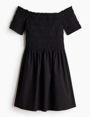 XS S M L XL XXLКоротка сукня з тканої тканини з відкритими плечима, облягаючим ліфом і короткими рукавами, обидві з облямівкою та невеликою оборкою по верхньому краю. Збірки на талії та розкльошена спідниця. Без підкладки