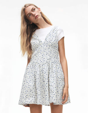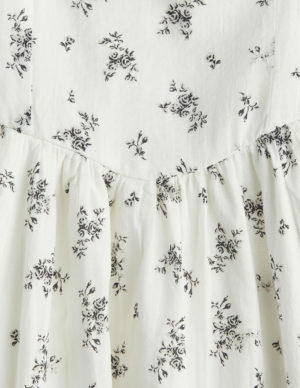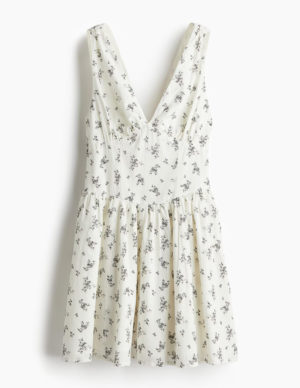XXS S MКоротка сукня з повітряної бавовняної тканини з V-подібним вирізом горловини, широкими зібраними бретелями та зібраними фігурними чашечками. Приталений ліф, зібраний шов на талії та розкльошена спідниця