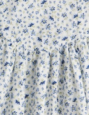 XS S M L XL XXLКоротка сукня з тканої тканини з відкритими плечима, облягаючим ліфом і короткими рукавами, обидві з облямівкою та невеликою оборкою по верхньому краю. Збірки на талії та розкльошена спідниця. Без підкладки