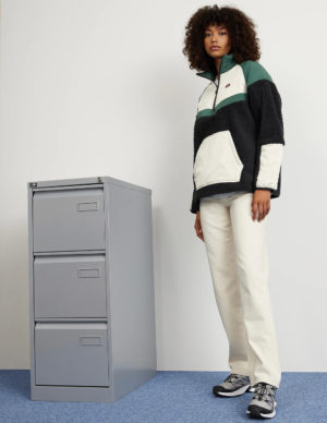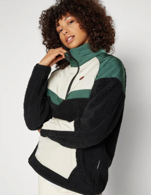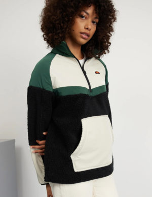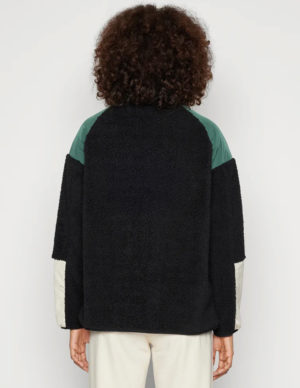 SКуртка з комбінованої тканини тедді та плащівки. Спереду велика кишеня-кенгуру, високий комір застібається на блискавку