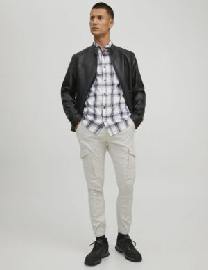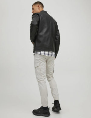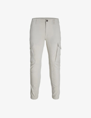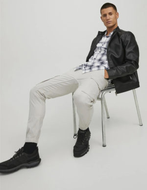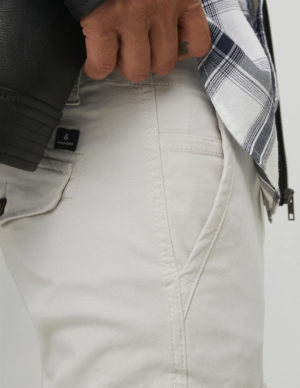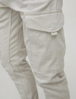 SБрюки-карго із бавовняної тканини. Спереду прорізні кишені та великі накладні кишені з обох боків, ззаду прорізні кишені з клапаном. Застібається на блискавку та ґудзик, еластичні манжети