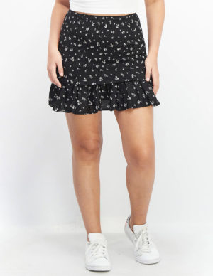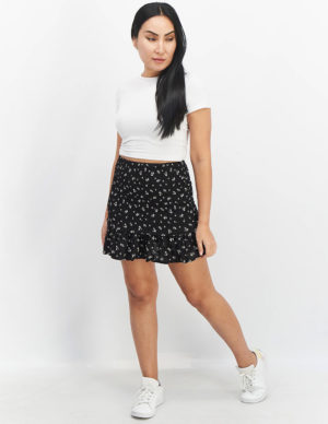 SКоротка спідниця зі зборкою на гумці зверху в квітковий принт із легкої віскозної тканини. Еластична талія, знизу оборка