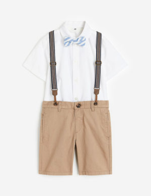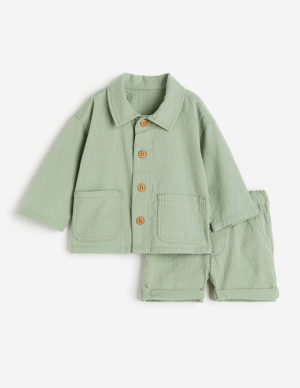 74 смКостюм з піджаком-сорочкою та шортів із повітряної бавовняної тканини. Піджак-сорочка з класичним коміром, спущеними плечима та накладними передніми кишенями. Застібається на ґудзики спереду. Шорти з регульованою талією, бічними кишенями та застібка на ґудзик