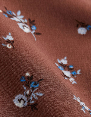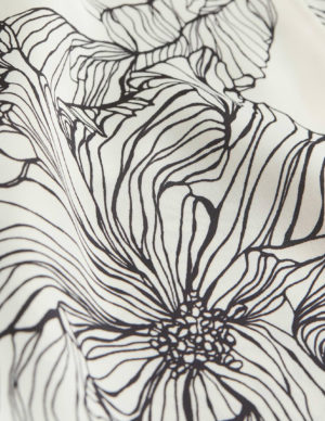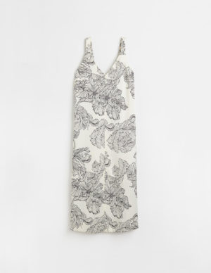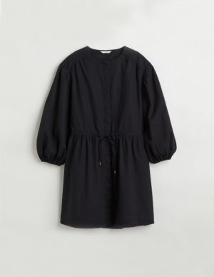 SКоротка сукня з лляно-бавовняної тканини з круглим вирізом, планкою з потайними гудзиками та кокеткою ззаду. Відрізний виріб з куліскою та вузькими зав’язками на талії. Довгі рукави-ліхтарики із вузькою закритою гумкою на манжетах. Без підкладки