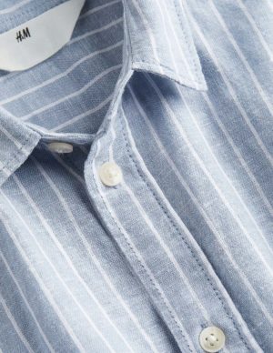 158 см 170 смКласична сорочка з короткими рукавами із суміші льону та бавовни в смужку. Комір з куточками, злегка спущена лінія плечового шва. Застібається на ґудзики, кокетка ззаду