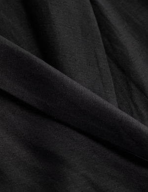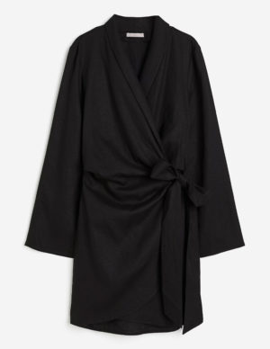 SСукня до коліна з довгими рукавами з віскози та льону. Шалевий комір та запах спереду з широкими зав’язками з одного боку та прихованою застібкою на ґудзик з іншого. Без підкладки