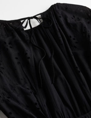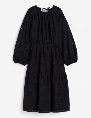 S M XLСукня до литок з тканої бавовняної тканини з вишивкою на люверсах. Круглий виріз горловини, вузькі зав’язки ззаду на горловині та частково відкрита спина. Довгі рукави-балони крою реглан з вузькою гумкою на манжетах. Вузька гумка на поясі та зібраний шов нижче стегон для додаткового об’єму. Частково на підкладці