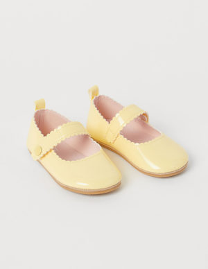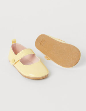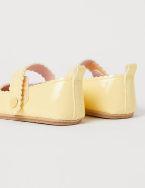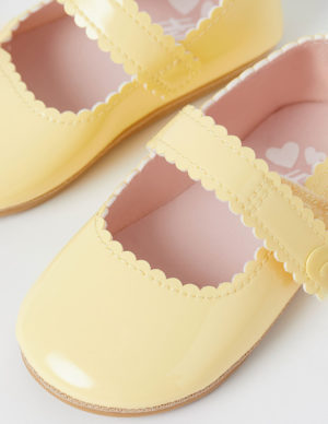 s-14Туфлі зі штучної лакованої шкіри з фестончатими краями. Язичок-липучка на стопі з декоративним ґудзиком «тон в тон». Петля ззаду, підошва з малюнком