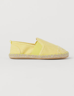 s-28Мокасини із бавовняного полотна. Блискучий носок, еластичні бічні панелі та плетене джутове оздоблення навколо підошви. Підкладка та устілки з бавовняного парусину, рифлені підошви