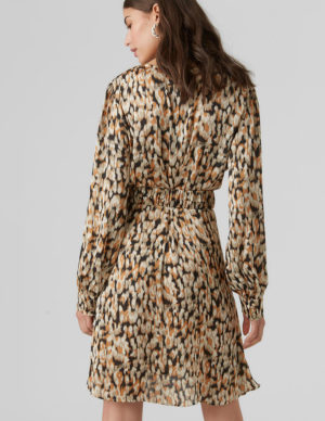 MСукня з принтом. Довгі рукава з еластичними манжетами, класичний комір з куточками. Застібається на ґудзики спереду, пояс на талії